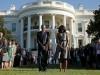 Madaxweyne Obama, oo ay wehliyaan xaaskiisa Michelle iyo shaqaalaha aqalka cad ayaa maalintan ku xusay daqiiqad aamusnaan ahbanaanka aqalka cad, saacaddumarka ay ahayd 8:46AM, markaasi oo ah waqtiga diyaaraddii koowaad ay ku dhacday xarunta ganacsiga adduunka ee New York.