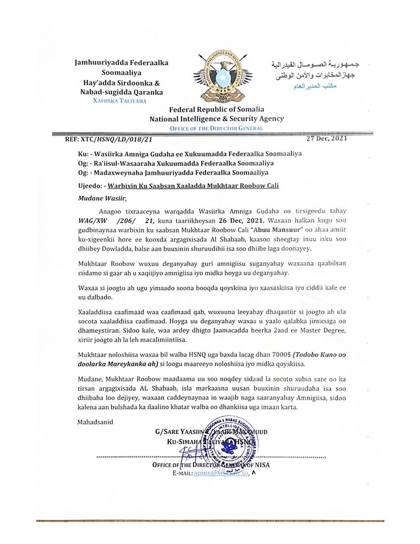 "Mukhtaar Roobow noloshiisa waxaa bil walba NISA uga baxda 7,000 oo dollar si loo maareeyo noloshiisa iyo midka qoyskiisa, maadaama uu xubin ka noqday Al-Shabaab, islamarkaana uusan buuxin shuruudaha soo dhiibaha loo dejiyay inuu waajib ka saaran yahay amnigiisa,” ayuu Yaasiin Farey ku yiri qoraalka.