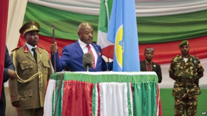 FILE - Burundi's President Pierre Nkurunziza is sworn in for a third term at a ceremony in the parliament in Bujumbura, Burundi, Aug. 20, 2015.